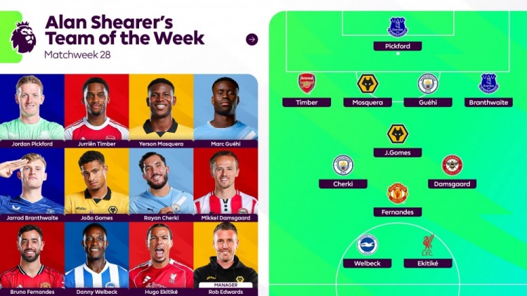 3月2日讯 阿兰·希勒选出英超第28轮最佳阵容,B费、埃基蒂克、格伊、谢尔基和廷伯入选。